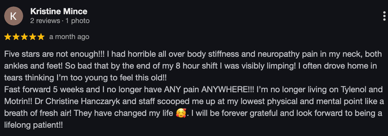 • Harvest or otherwise collect information about others, including e-mail addresses, without their consent.We have no obligation to monitor the Communication Services. However, we reserve the right to review materials posted to a Communication Service and to remove any content that does not comply with these terms or any publicly posted content that includes personal and confidential information. We reserve the right to terminate your access to any or all of the Communication Services at any time without notice for any reason whatsoever. Content uploaded to a Communication Service may be subject to posted limitations on usage, reproduction, and/or dissemination. You are responsible for adhering to such limitations if you download the content. If you would like to remove your own review from this Site, please contact us.liability disclaimerTHE INFORMATION, SOFTWARE, PRODUCTS, AND SERVICES INCLUDED IN OR AVAILABLE THROUGH THIS SITE MAY INCLUDE INACCURACIES OR TYPOGRAPHICAL ERRORS. CHANGES ARE PERIODICALLY ADDED TO THE INFORMATION HEREIN. WE AND/OR OUR SUPPLIERS MAY MAKE IMPROVEMENTS AND/OR CHANGES IN THIS SITE AT ANY TIME.ADVICE RECEIVED VIA THIS SITE SHOULD NOT BE RELIED UPON FOR PERSONAL, MEDICAL, LEGAL, OR FINANCIAL DECISIONS AND YOU SHOULD CONSULT AN APPROPRIATE PROFESSIONAL FOR SPECIFIC ADVICE TAILORED TO YOUR SITUATION.WE AND/OR OUR SUPPLIERS MAKE NO REPRESENTATIONS ABOUT THE SUITABILITY, RELIABILITY, AVAILABILITY, TIMELINESS, AND ACCURACY OF THE INFORMATION, SOFTWARE, PRODUCTS, SERVICES, AND RELATED GRAPHICS CONTAINED ON THIS SITE FOR ANY PURPOSE. TO THE MAXIMUM EXTENT PERMITTED BY APPLICABLE LAW, ALL SUCH INFORMATION, SOFTWARE, PRODUCTS, SERVICES AND RELATED GRAPHICS ARE PROVIDED “AS IS” WITHOUT WARRANTY OR CONDITION OF ANY KIND.WE AND/OR OUR SUPPLIERS HEREBY DISCLAIM ALL WARRANTIES AND CONDITIONS WITH REGARD TO THIS INFORMATION, SOFTWARE, PRODUCTS, SERVICES AND RELATED GRAPHICS, INCLUDING ALL IMPLIED WARRANTIES OR CONDITIONS OF MERCHANTABILITY, FITNESS FOR A PARTICULAR PURPOSE, TITLE AND NON-INFRINGEMENT.TO THE MAXIMUM EXTENT PERMITTED BY APPLICABLE LAW, IN NO EVENT SHALL WE AND/OR OUR SUPPLIERS BE LIABLE FOR ANY DIRECT, INDIRECT, PUNITIVE, INCIDENTAL, SPECIAL, CONSEQUENTIAL DAMAGES OR ANY DAMAGES WHATSOEVER INCLUDING, WITHOUT LIMITATION, DAMAGES FOR LOSS OF USE, DATA OR PROFITS, ARISING OUT OF OR IN ANY WAY CONNECTED WITH THE USE OR PERFORMANCE OF THIS SITE, WITH THE DELAY OR INABILITY TO USE THIS SITE OR RELATED SERVICES, THE PROVISION OF OR FAILURE TO PROVIDE SERVICES, OR FOR ANY INFORMATION, SOFTWARE, PRODUCTS, SERVICES AND RELATED GRAPHICS OBTAINED THROUGH THIS SITE, OR OTHERWISE ARISING OUT OF THE USE OF THIS SITE, WHETHER BASED ON CONTRACT, TORT, NEGLIGENCE, STRICT LIABILITY OR OTHERWISE, EVEN IF WE OR ANY OF OUR SUPPLIERS HAS BEEN ADVISED OF THE POSSIBILITY OF DAMAGES. BECAUSE SOME STATES/JURISDICTIONS DO NOT ALLOW THE EXCLUSION OR LIMITATION OF LIABILITY FOR CONSEQUENTIAL OR INCIDENTAL DAMAGES, THE ABOVE LIMITATION MAY NOT APPLY TO YOU. IF YOU ARE DISSATISFIED WITH ANY PORTION OF THIS SITE, OR WITH ANY OF THESE TERMS OF USE, YOUR SOLE AND EXCLUSIVE REMEDY IS TO DISCONTINUE USING THIS SITE.Copyright and trademark noticesAll contents of this website are Copyright © 2025 Hanczaryk Chiropractic Neurology Group. All Rights Reserved. All logos are trademarks and service marks of Hanczaryk Chiropractic Neurology Group. All other trademarks, service marks and logos used in this Site are the property of their respective owners.TrademarksThe names of actual companies and products mentioned herein may be the trademarks of their respective owners. The example companies, organizations, products, people, and events depicted herein are fictitious. No association with any real company, organization, product, person, or event is intended or should be inferred. Any rights not expressly granted herein are reserved.Messaging summaryBy opting into our SMS messaging service, you agree to receive text messages from Hanczaryk Chiropractic Neurology Group regarding your appointments, feedback requests, and office notifications. Message frequency may vary based on your interactions with our services.Types of Messages: