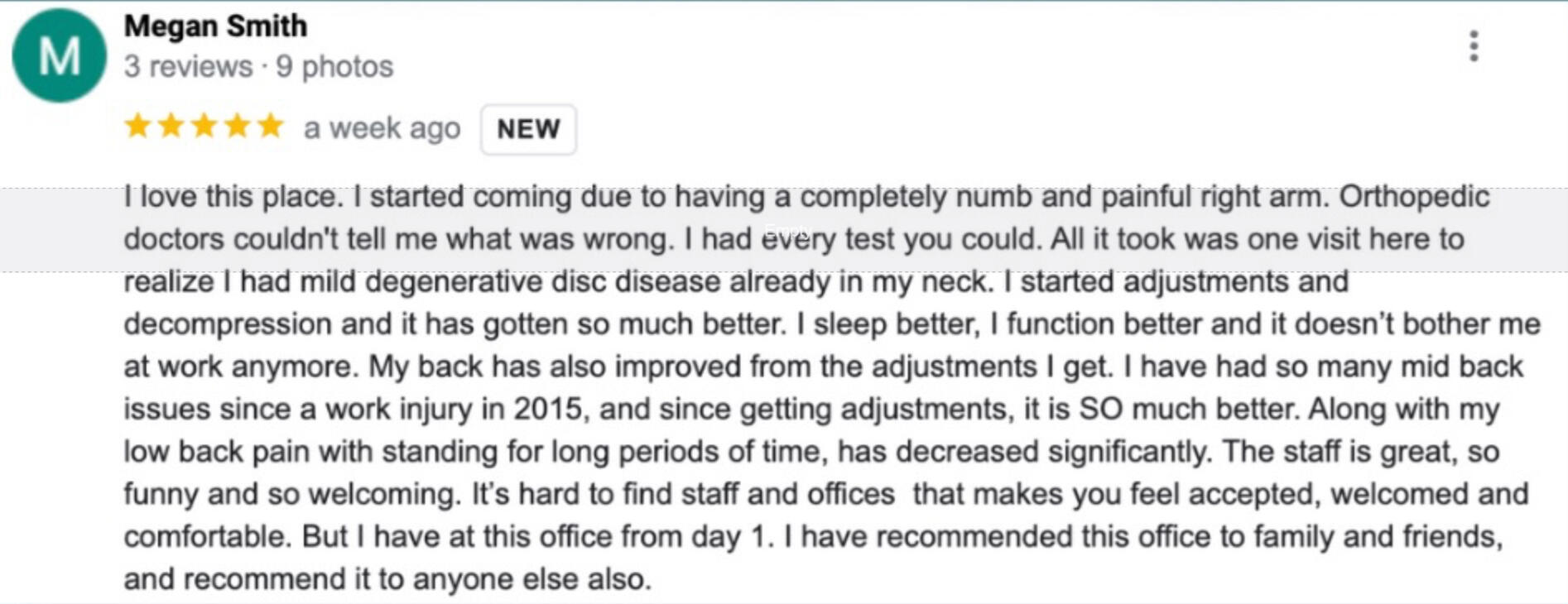 I was disappointed when I had to switch chiropractors due to insurance. However, when I got to this chiropractor, I was happily surprised. They are very comprehensive. They are fast, efficient and provide a wide range of services. Rather than just a basic adjustment I received Decompression, electrical muscle stimulation, and exercises to help support my new adjustments. We went over my follow up x-rays and progression of my spinal correction results. I am showing improvement. I am still not there yet, but I do have faith care chiropractic now. - Vanessa