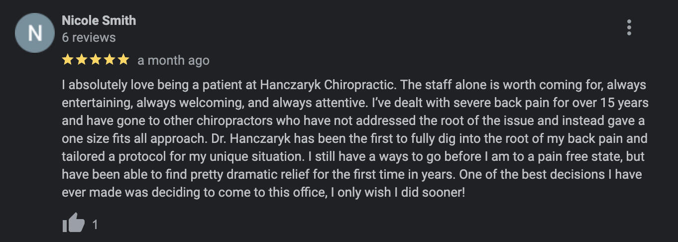 Hanczaryk Chiropractic Neurology Group is more than just a health care clinic, we are an urban retreat dedicated to the overall health and well being of our patients. We have what modern healthcare is missing, genuine care and comfort of our patients is our highest mission. With our state of the art training and equipment, our patients receive the highest level of chiropractic and neurology healthcare that focuses on getting them out of pain and back to living the life they deserve! We strive to find the cause of disease as well as develop an individualized treatment plan specially designed for each patient. Pain relief is our passion.